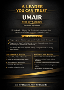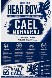 We are incredibly proud of all the pupils taking part in the campaign. Standing for election takes courage, and all candidates are showing great enthusiasm, responsibility, and respect as they begin this journey.